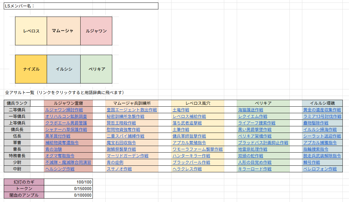 LSメンバー向けアサルト進行表 のスプレッドシートを作りました。